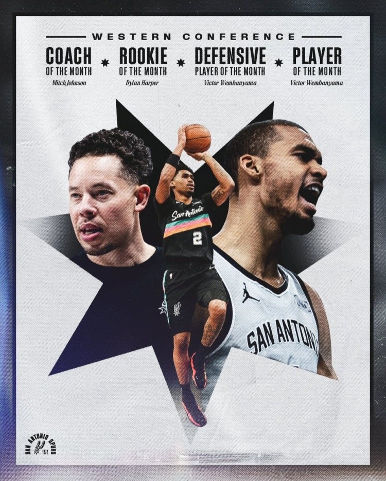 全是你们的!马刺包揽西部月最佳球员/教练/新秀 NBA历史首队